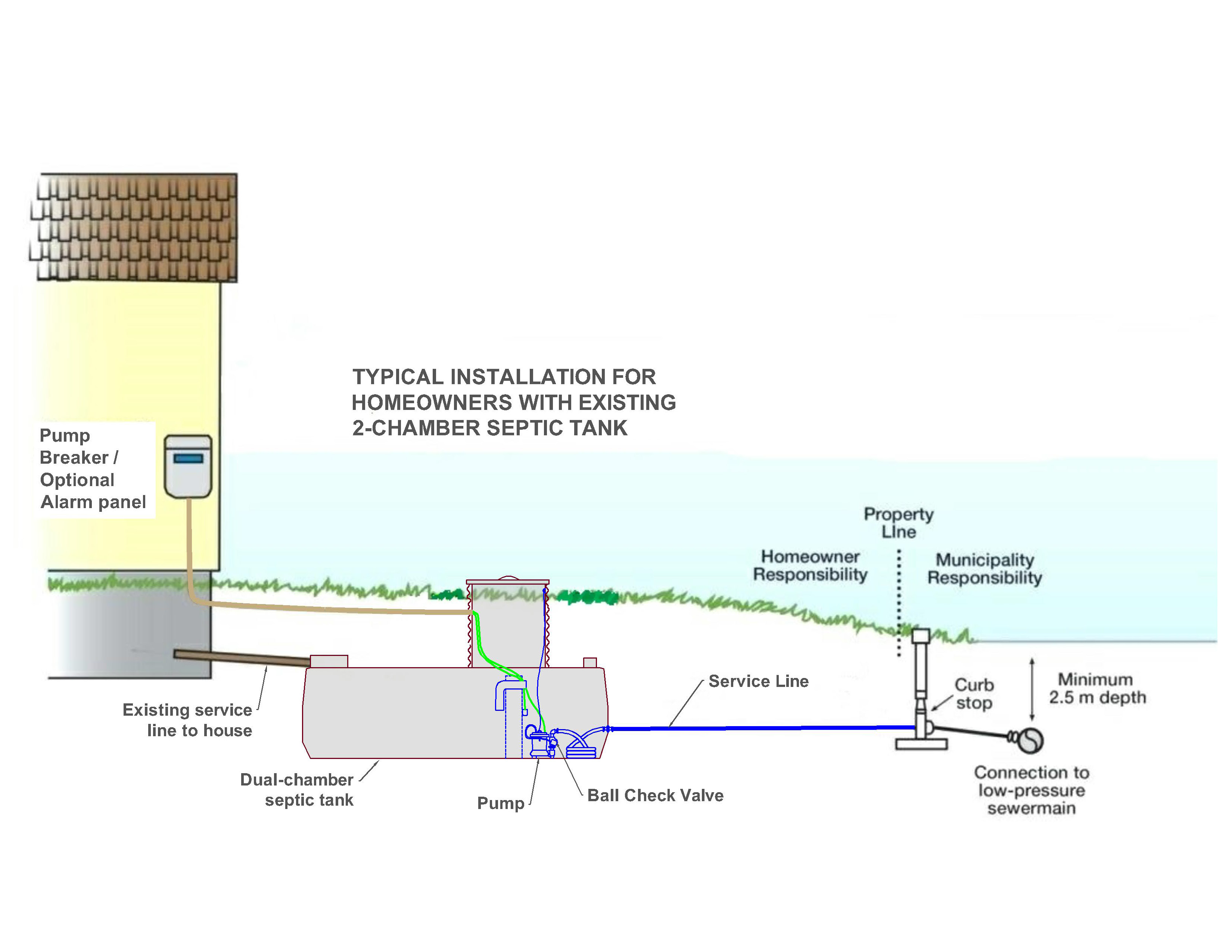 This is a type of sewer where the effluent (liquids) are pumped from your septic tank directly into a wastewater pipeline, eliminating the need for a septic field. A low pressure sewer requires septic tank and pump to be maintained by property owner. (Click Image to the Right for Larger View