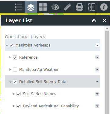 Manitoba Agriculture has made soil maps available for the public to view. The below link will direct you to their website which allows you to zoom in on a specific area in Manitoba to determine what soil class it is. Ensure the required layers are checked off in the layer list in the top right side of their page as shown below.